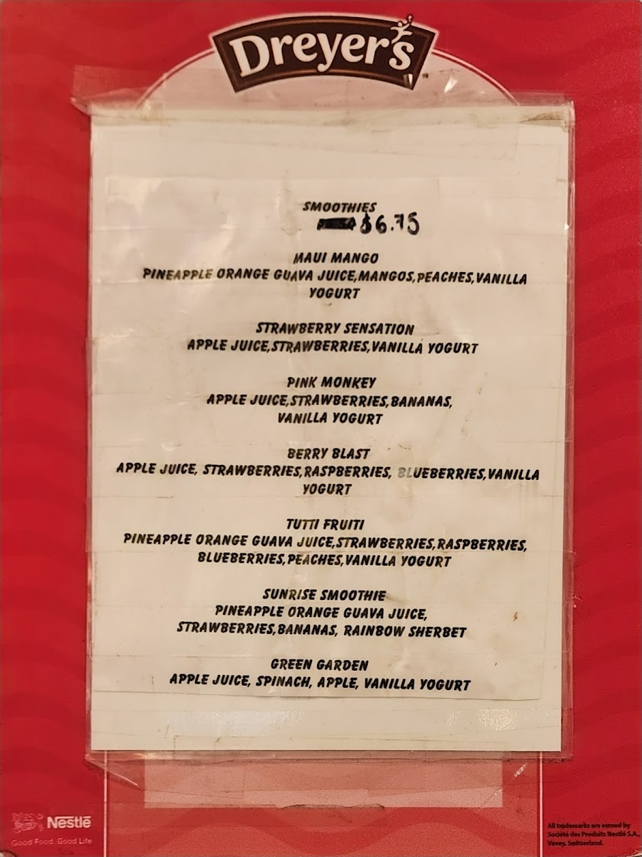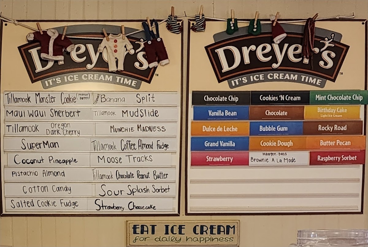 - Specialty Ice Creams and Sorbets: A wide assortment of flavors including banana cream pie, vanilla yogurt, strawberry cheesecake, raspberry cheesecake oreo, mudslide, s’mores, rocky road, birthday cake, rainbow sherbert, raspberry sorbet, pistachio almond, cookie dough, sea salt cookie fudge, chocolate chip peanut butter cookie dough, coconut pineapple, cotton candy, caramel toffee crunch, cookies 'n' cream, and campfir.